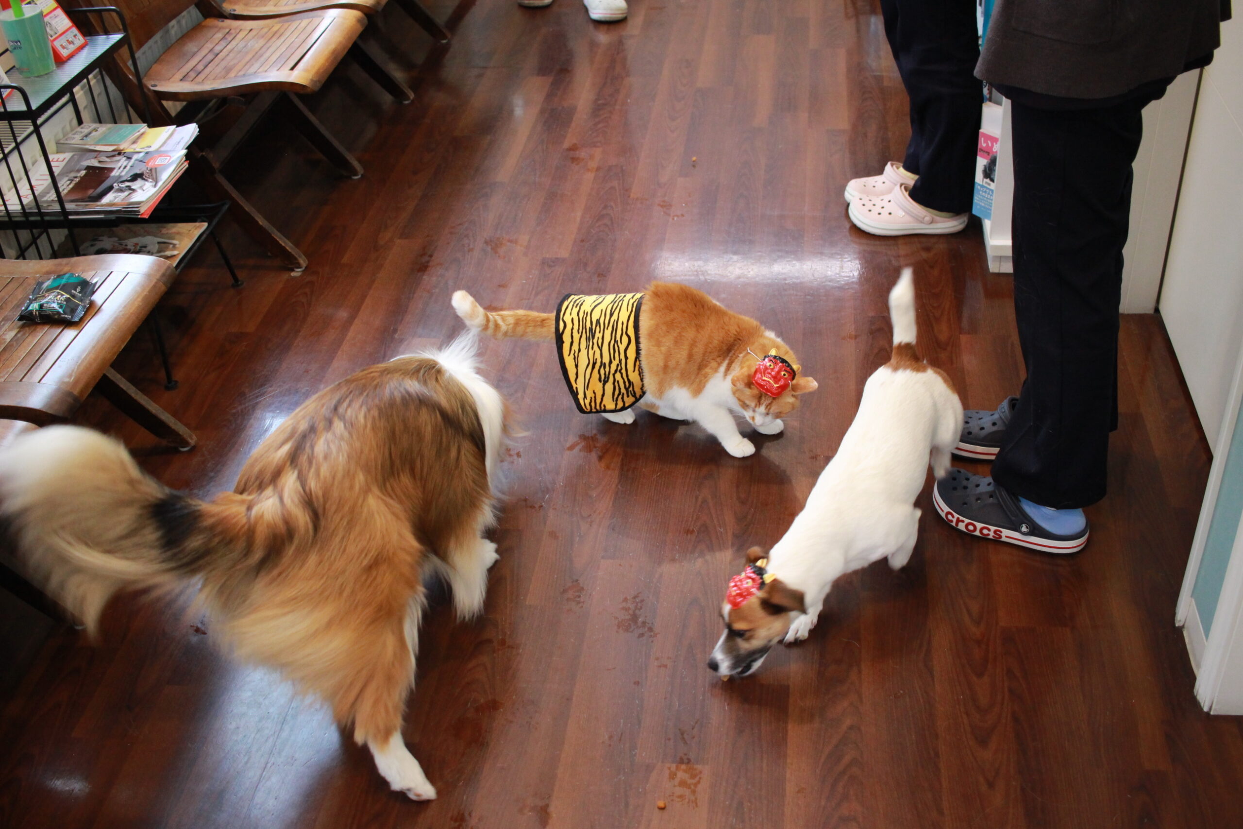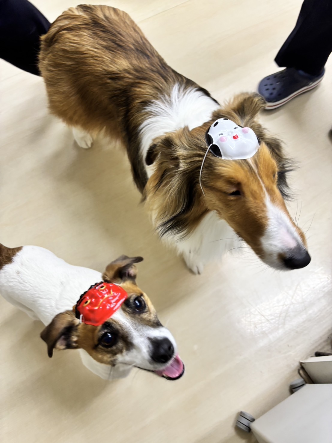 ちょっと遅くなりましたが、2月3日に毎年恒例の「ふたば動物病院豆まき会」を行いました。まだかまだかとの勢いの「なんもさ」号と、オカメのお面がすこし鬱陶しそうな顔をしてる「こなす」号。