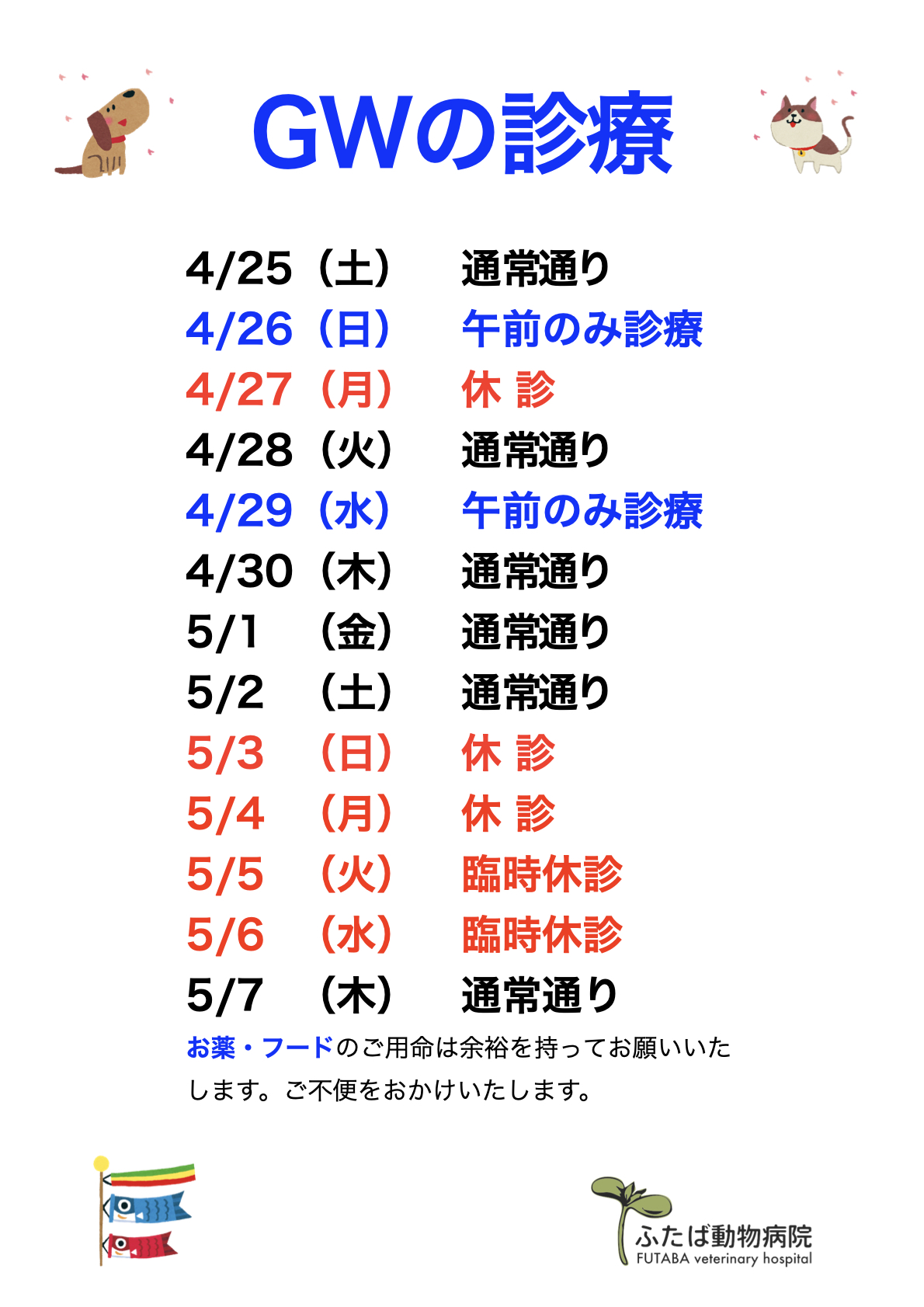 ゴールデンウィークのお知らせ | ふたば動物病院